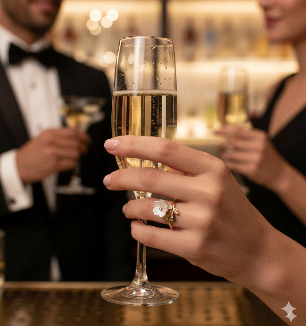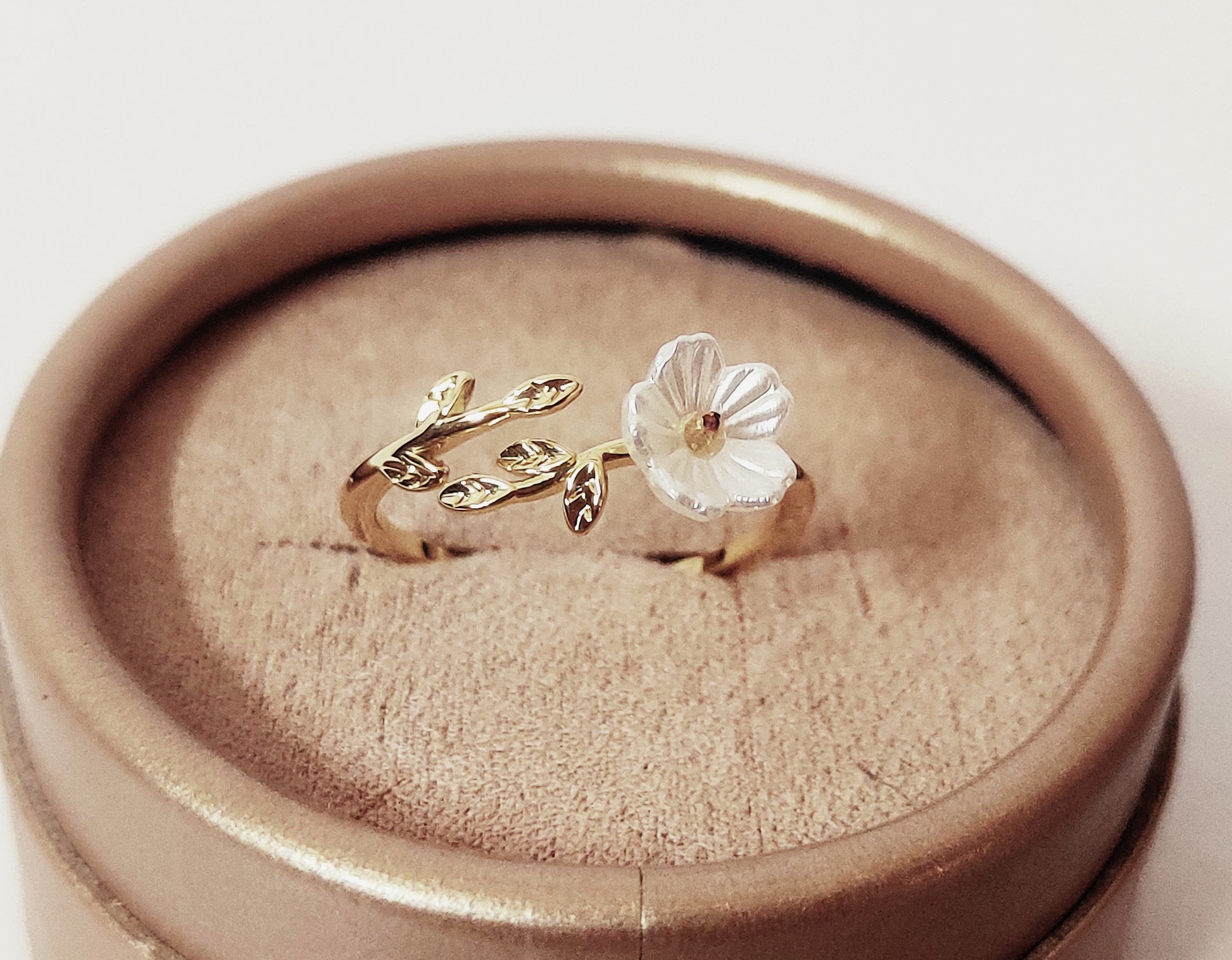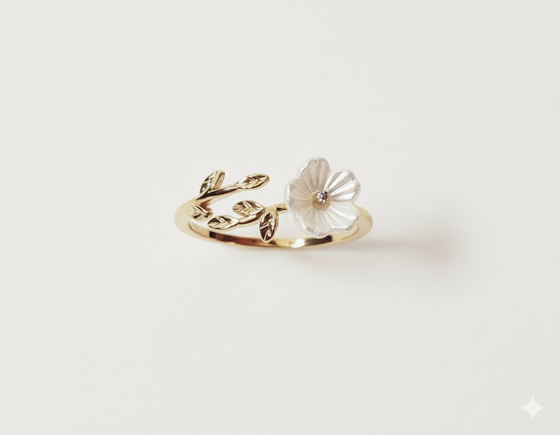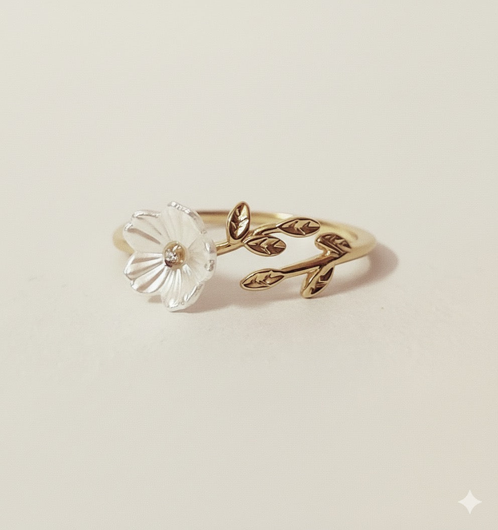 Bring nature’s elegance to your fingertips with this enchanting floral design. Crafted on a stainless steel base with a gold anti-tarnish coating, the ring showcases a delicate crystal-carved flower accented with a sparkling stone at its center. The adjoining golden vine with intricately detailed leaves wraps gracefully around your finger, creating a fresh and romantic look. With its adjustable size, this ring offers both style and comfort, making it perfect for everyday wear or gifting.